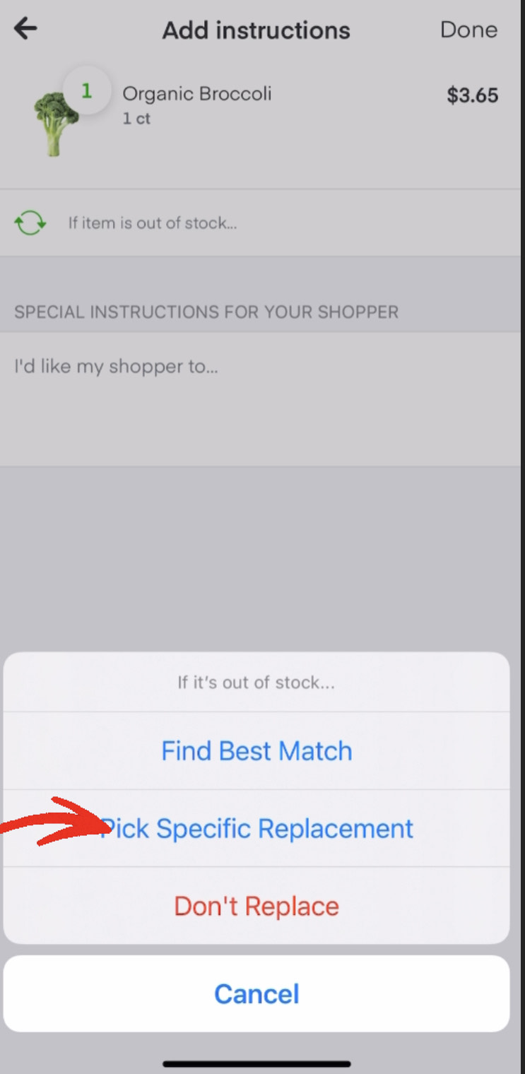 Screen on Instacart app to select a specific replacementHit "if item is out of stock", then select from the following options: Find Best Match, Pick Specific Replacement or Don't Replace.