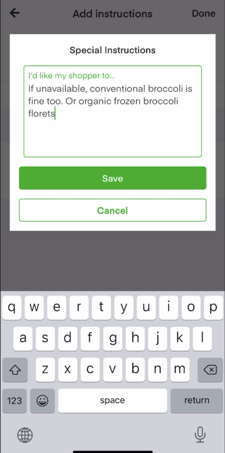 So you can pick one like the steamable organic broccoli that's frozen and in addition leave special instructions for the shopper that conventional broccoli would be fine too.